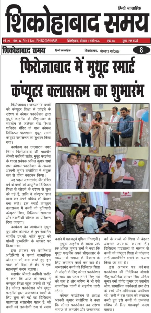 - Firozabad, Uttar Pradesh:Smart Computer Classroom with furniture support benefiting ~200 students